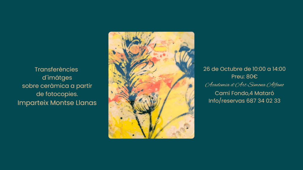 Curs de Transferència d’Imatges sobre Ceràmica amb Montse Llanas T’agradaria aprendre a transferir els teus propis dissenys sobre ceràmica sense necessitat de calcomanies ni serigrafia? El proper 26 d’octubre tenim l’oportunitat perfecta per a tu. Què aprendràs en aquest taller de ceràmica? El dia 26 d’octubre de 10 a 14h podràs realitzar un curs especialitzat
